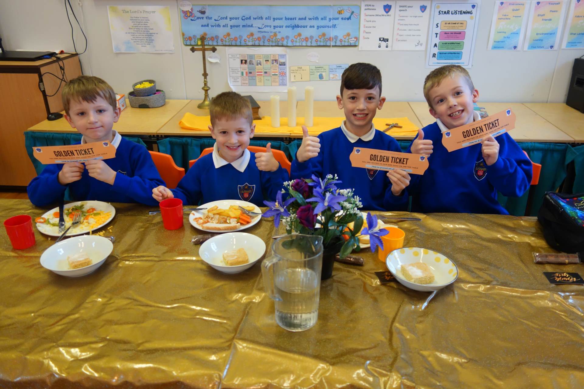 Every two weeks, the lucky winners get to sit at a special table where they will be served by the adults and enjoy their lunch on the golden plates and drink from the golden cups. This reward applies to all, whether hot or packed lunches and the children certainly enjoy this special time together.